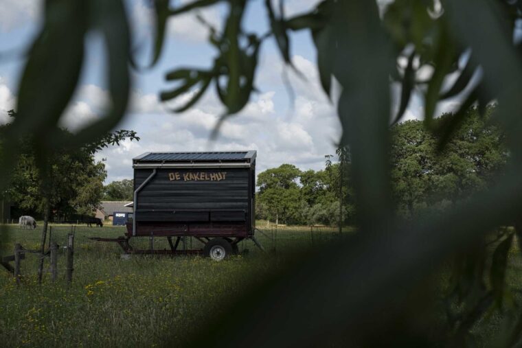 Onze kippen overnachten in een, door een deelnemer gemaakte, mobiele kippenschuur, de kakelhut.