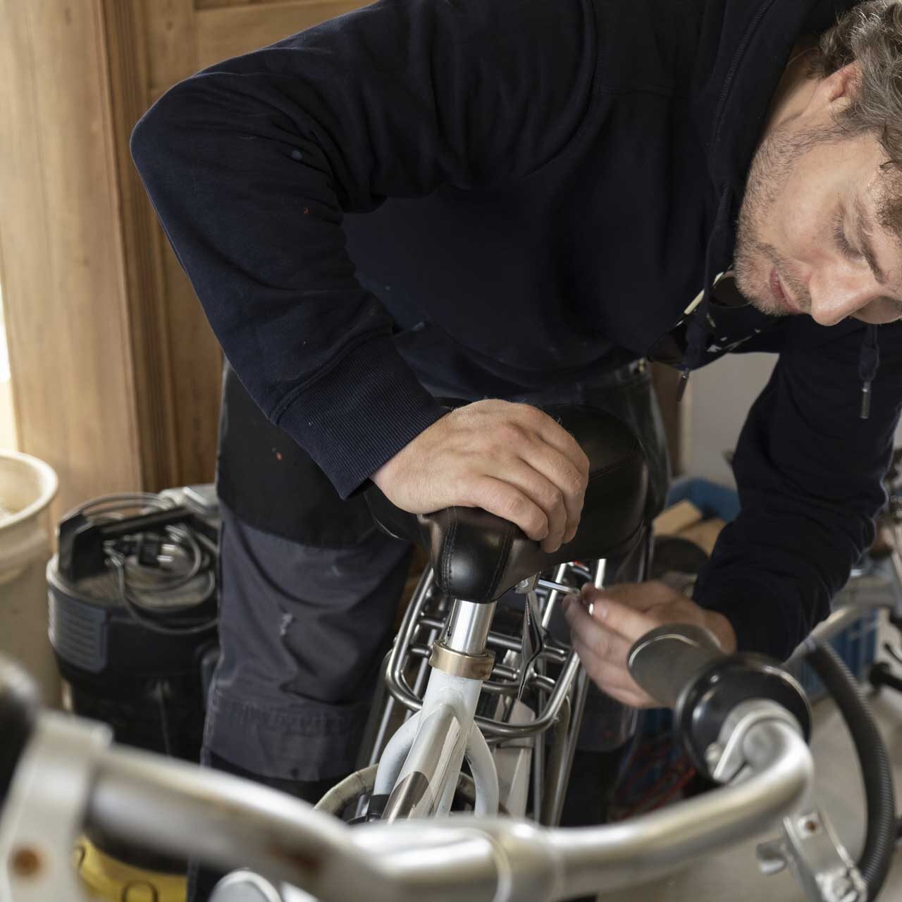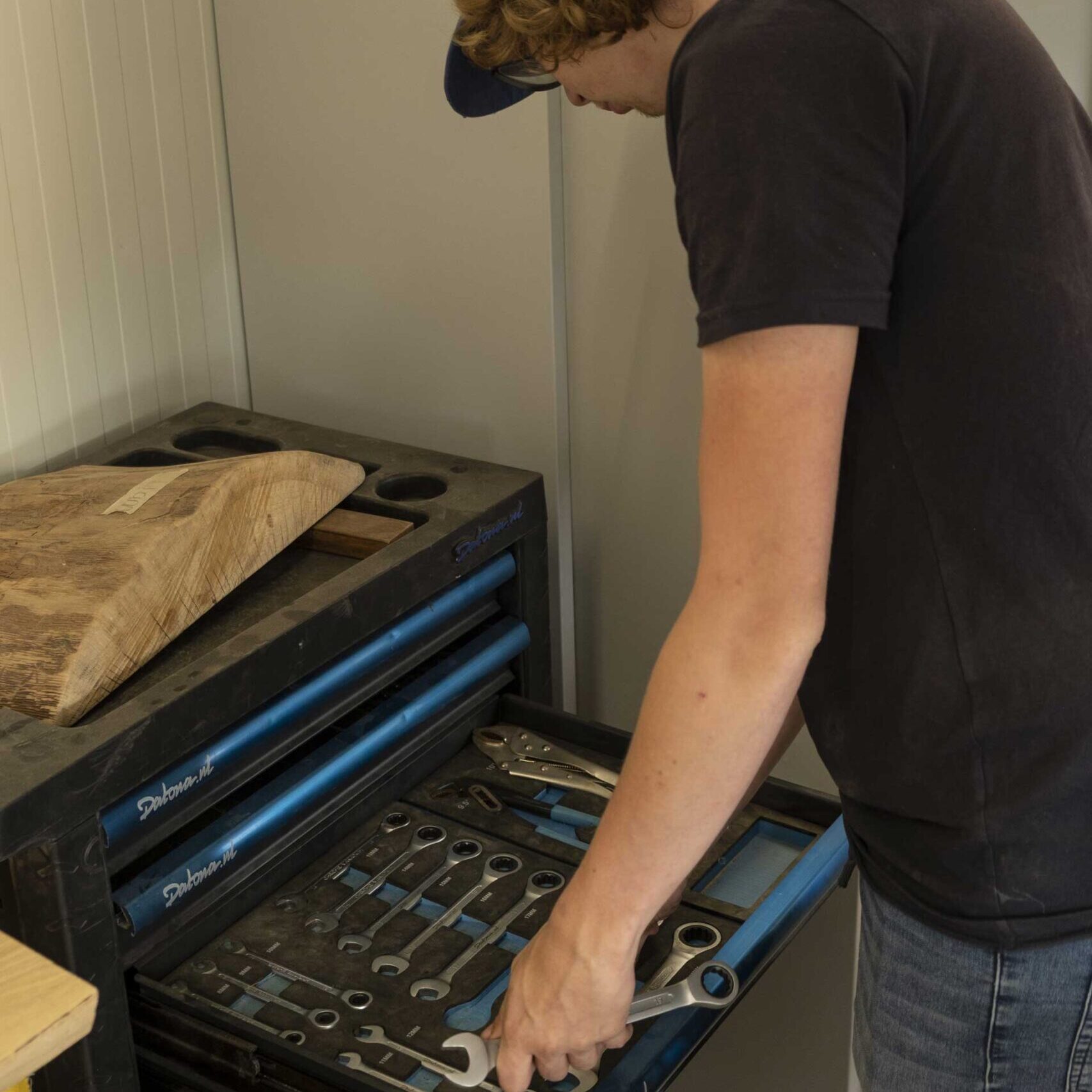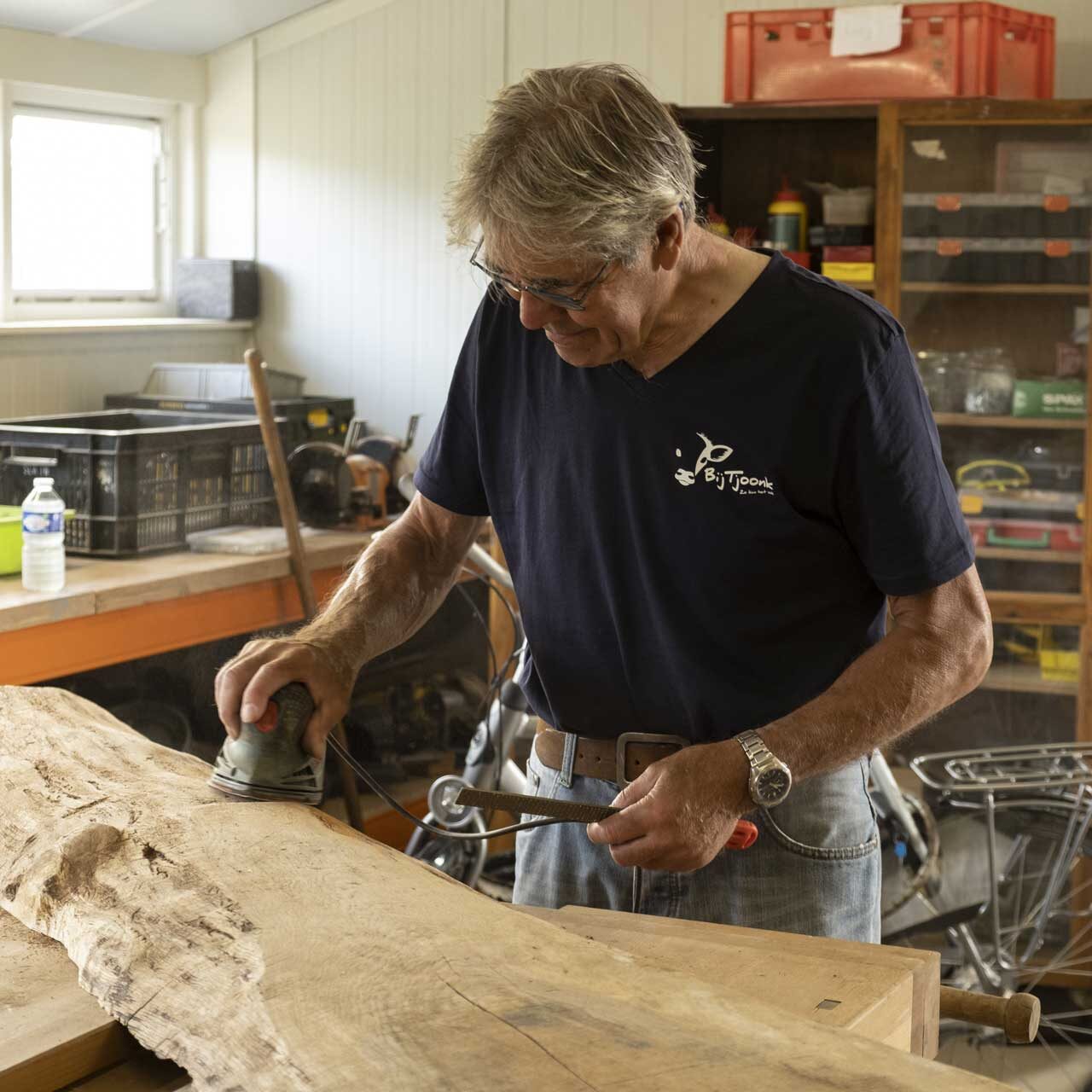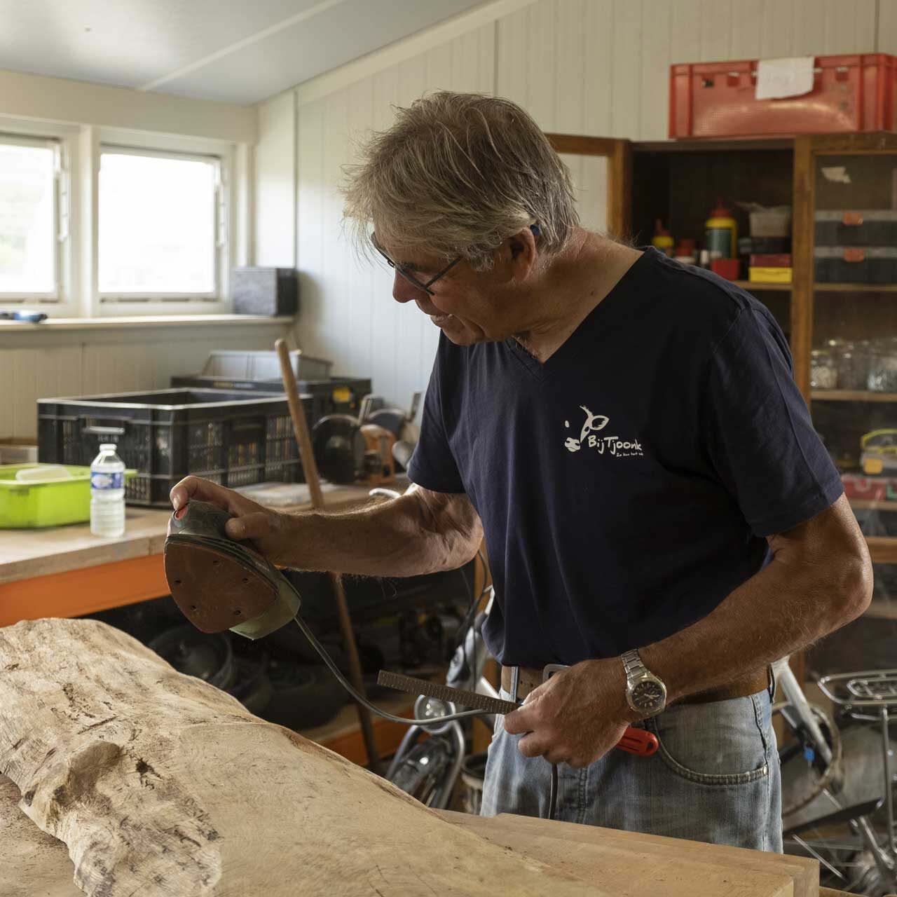 Boren, zagen, schuren en sleutelen, dat is wat we onder andere doen in onze werkplaats. Waar gewerkt wordt gaan dingen kapot, dat is bij Bij Tjoonk niet anders. Een kapot apparaat daagt uit tot repareren, en als dat niet lukt is volledig demonteren ook een leuke klus. Maar natuurlijk maken we ook mooie producten voor op de boerderij, op bestelling of in ons winkeltje.